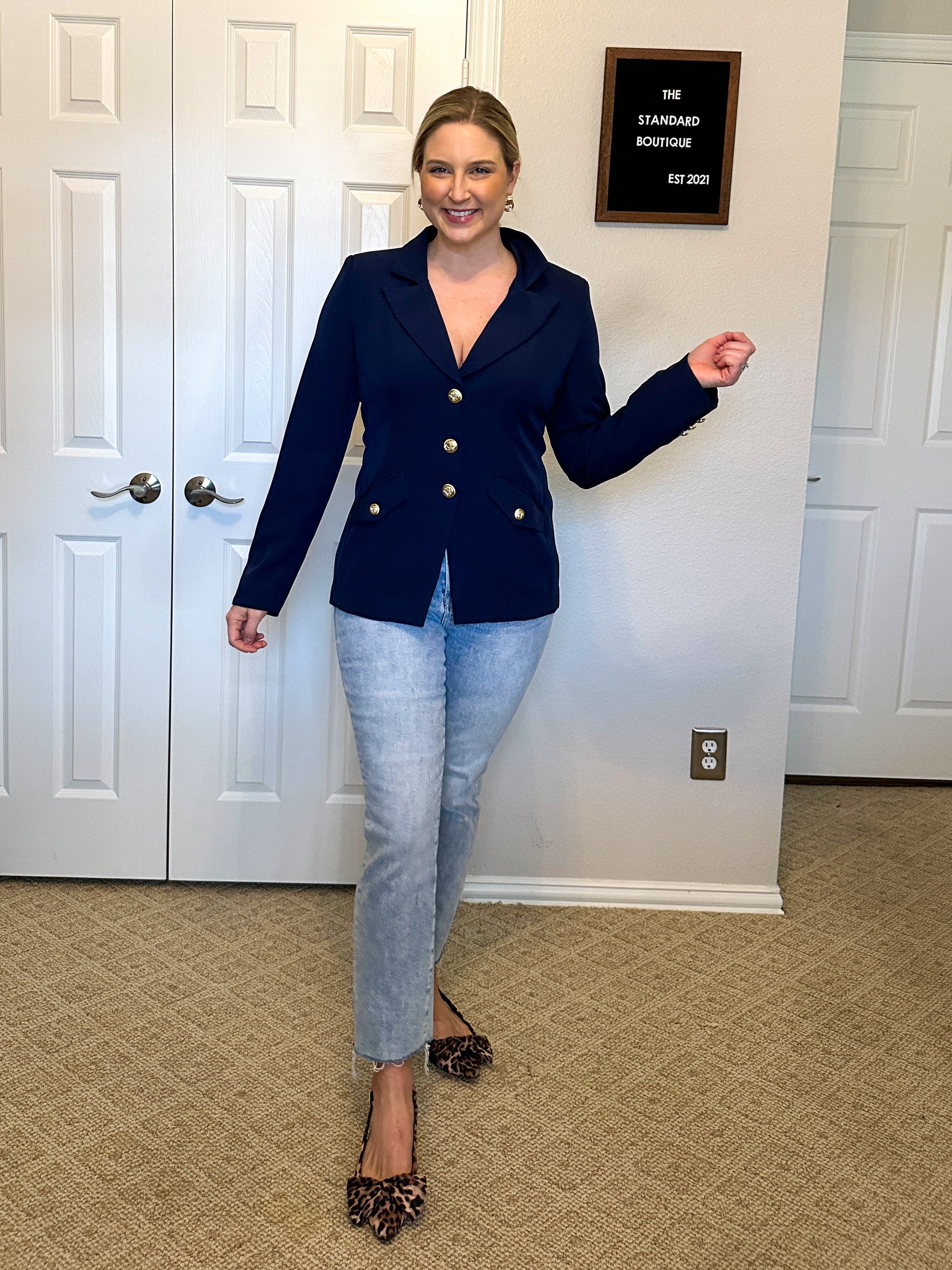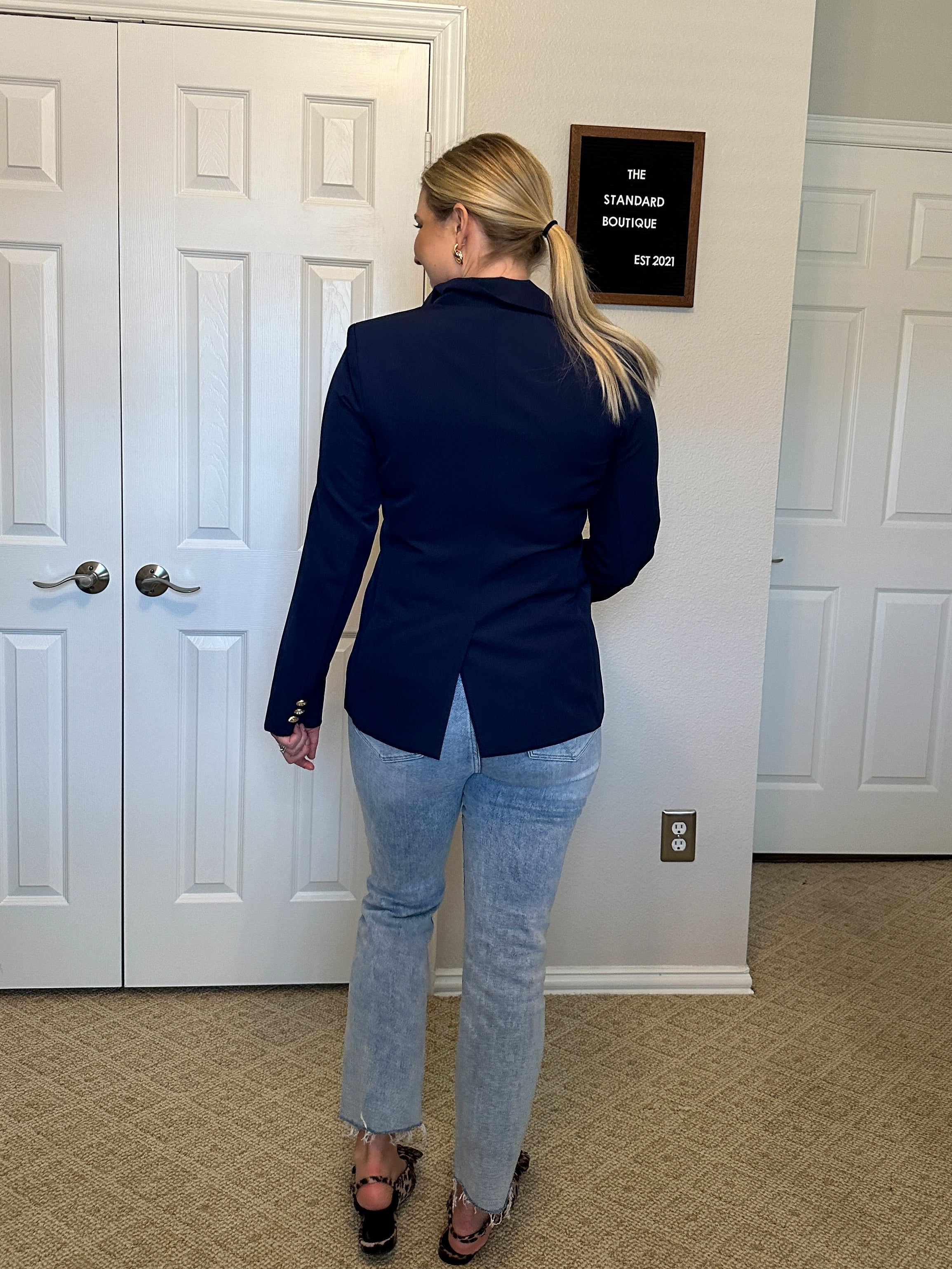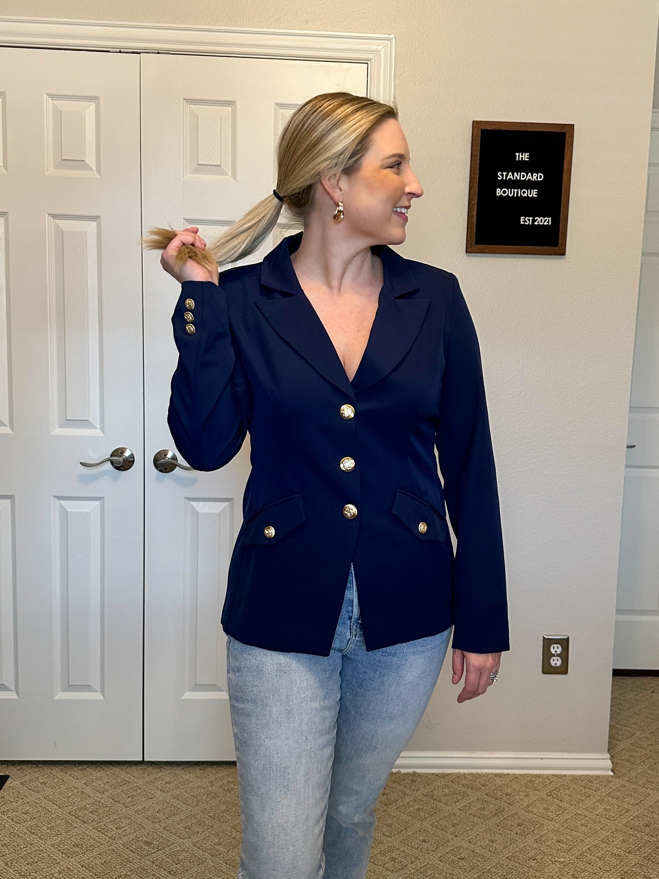 Gold Hardware button cuff blazer, navy, lined and longsleeve.