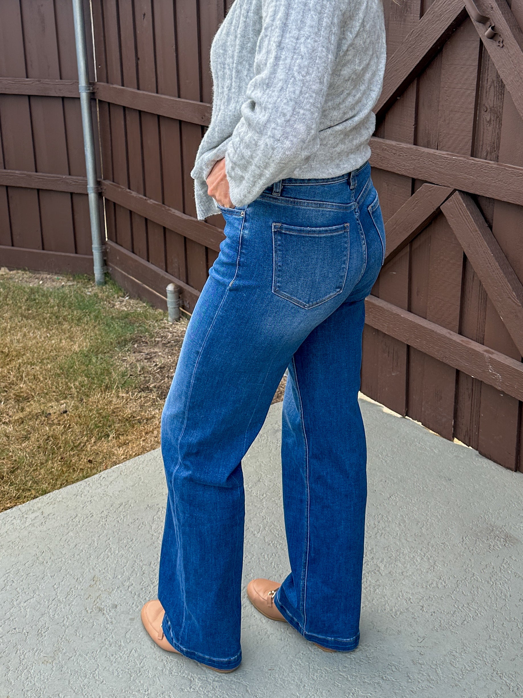 Meet the wide-leg denim that does everything you want it to. The Captain Blue Mica Denim combines an elevated silhouette with modern comfort, giving you that clean, elongated leg line without sacrificing stretch or softness. The high-rise fit smooths and supports, while the wide-leg cut keeps things effortless and on-trend.
