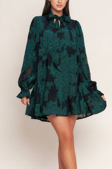 Holiday Floral Mini featuring Deep Green Floral Print and Black lining. Long sleeves with charming ruffled cuffs frame this elegant burnout woven mini dress, while a flattering front tie detail and ruffled hemline add movement and dimension. Perfect for holiday gatherings and special occasions.