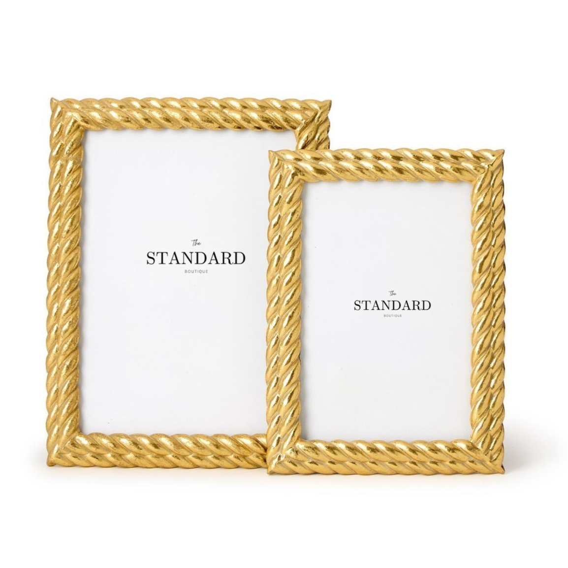 Elevate your décor with the Gold Double Rope Frame, available in both 4x6 and 5x7 sizes. Its distinctive double rope design and rich gold finish add a touch of elegance and sophistication to any room. Perfect for showcasing your favorite memories, this frame not only protects your photos but also enhances their visual appeal. Crafted to complement various styles, it effortlessly blends classic charm with modern flair, making it a timeless addition to your home or office. Showcase your cherished moments with a frame that truly stands out.