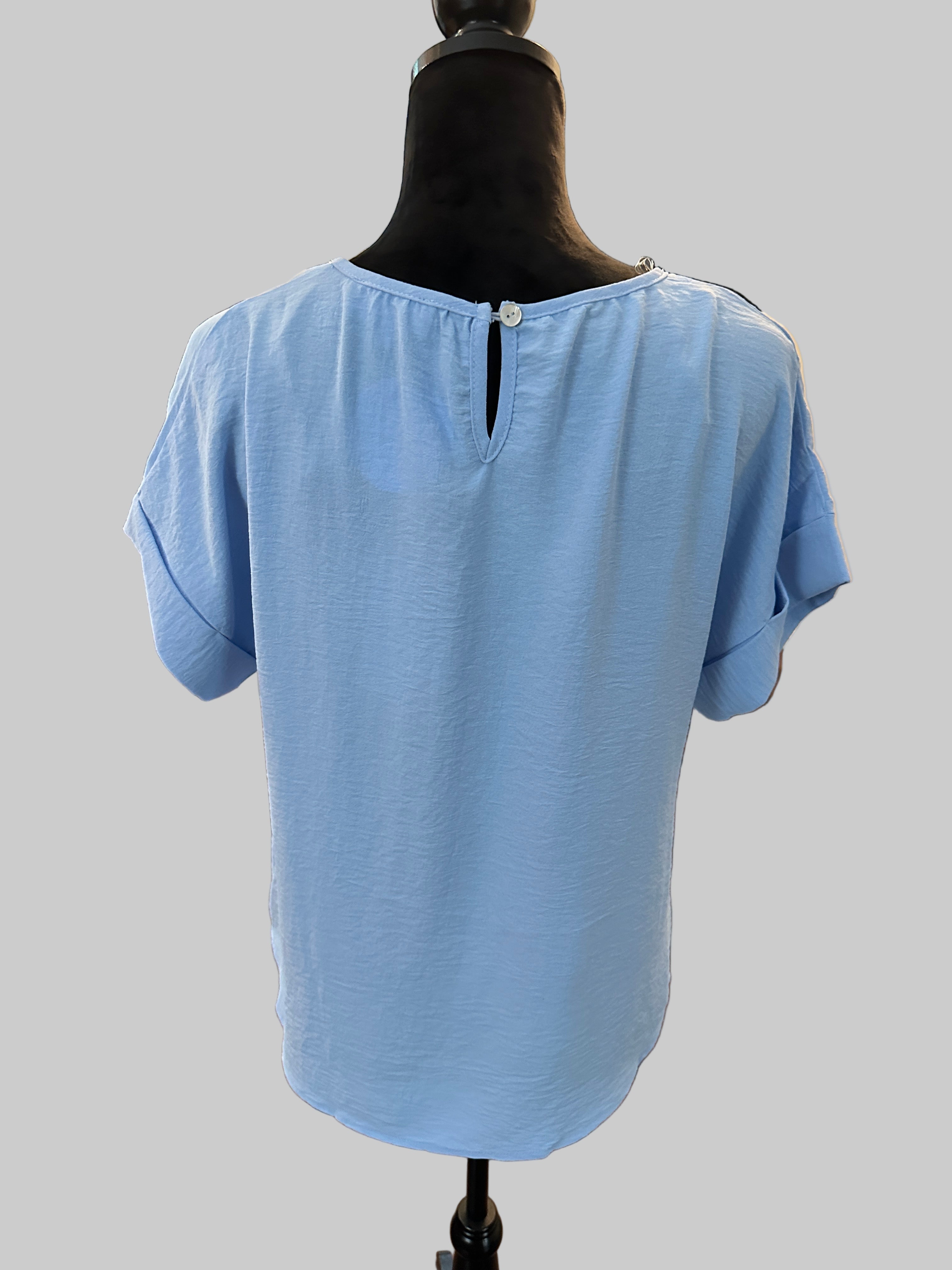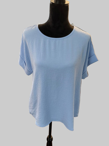 Our light blue top is relaxed and slightly oversized fit for all-day comfort. The short sleeves feature a subtle rolled-up hem, adding a touch of casual charm. Perfect for any season, this classic wardrobe staple pairs easily with your favorite jeans or skirts, making it an essential piece for everyday wear. S-L.