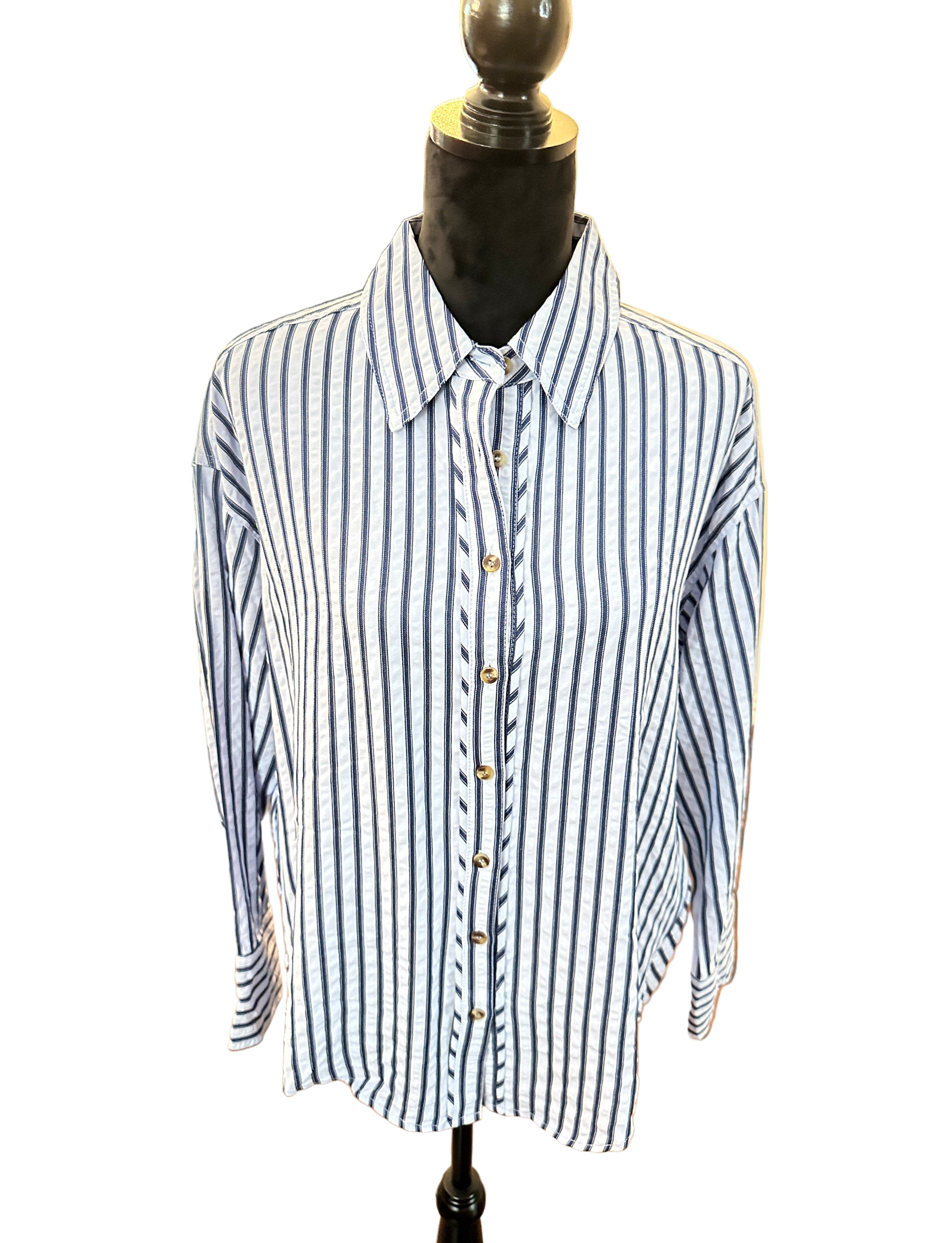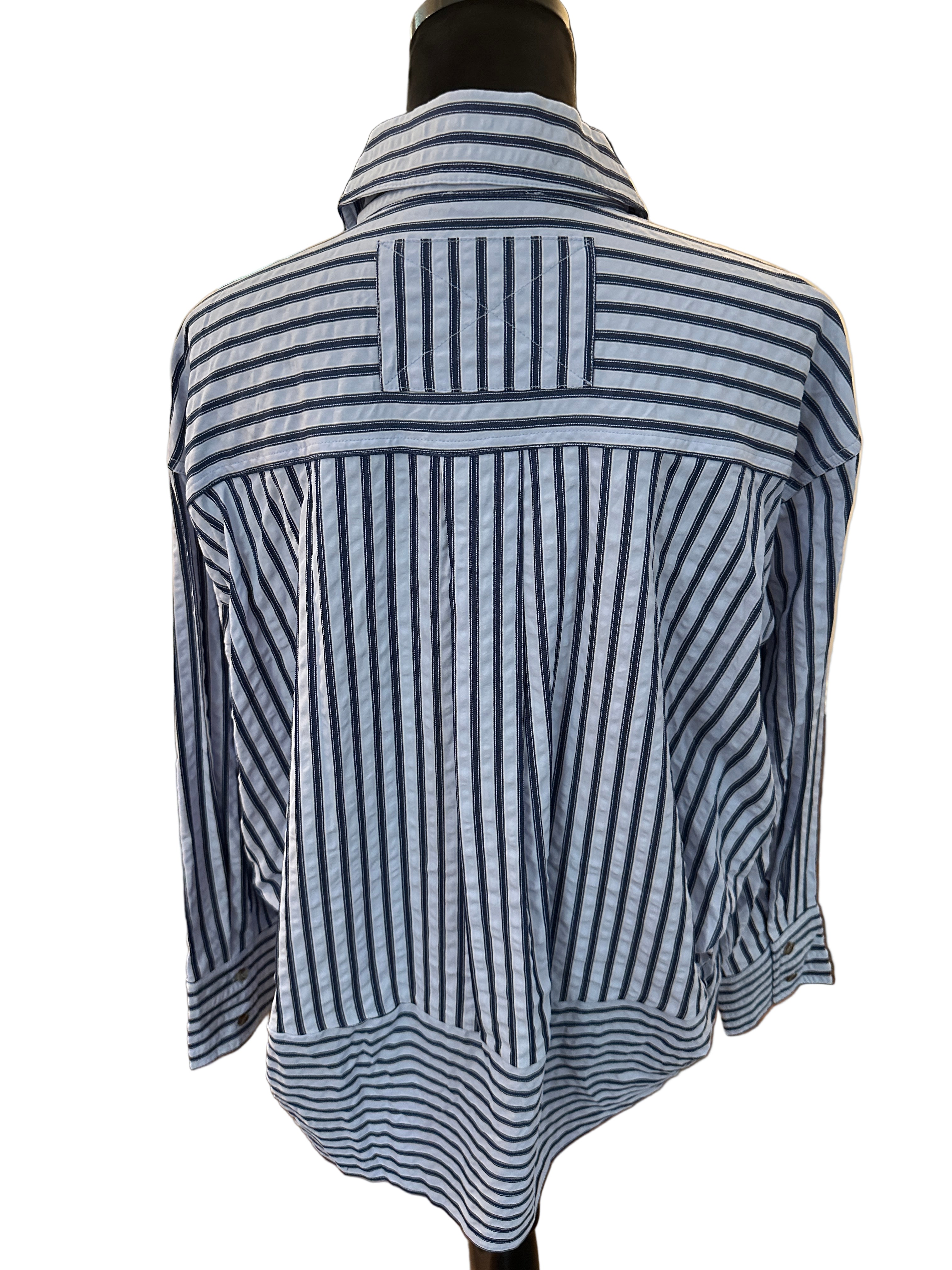 Elevate your wardrobe with this Striped Chambray Button Top, featuring a classic collared design and long sleeves for versatile wear. The vertical navy and chambray stripes create a sleek, elongating effect, while a playful horizontal stripe detail on the lower back adds unexpected charm. Perfect for both casual and polished looks, this button-up top effortlessly combines style and comfort. S-L.