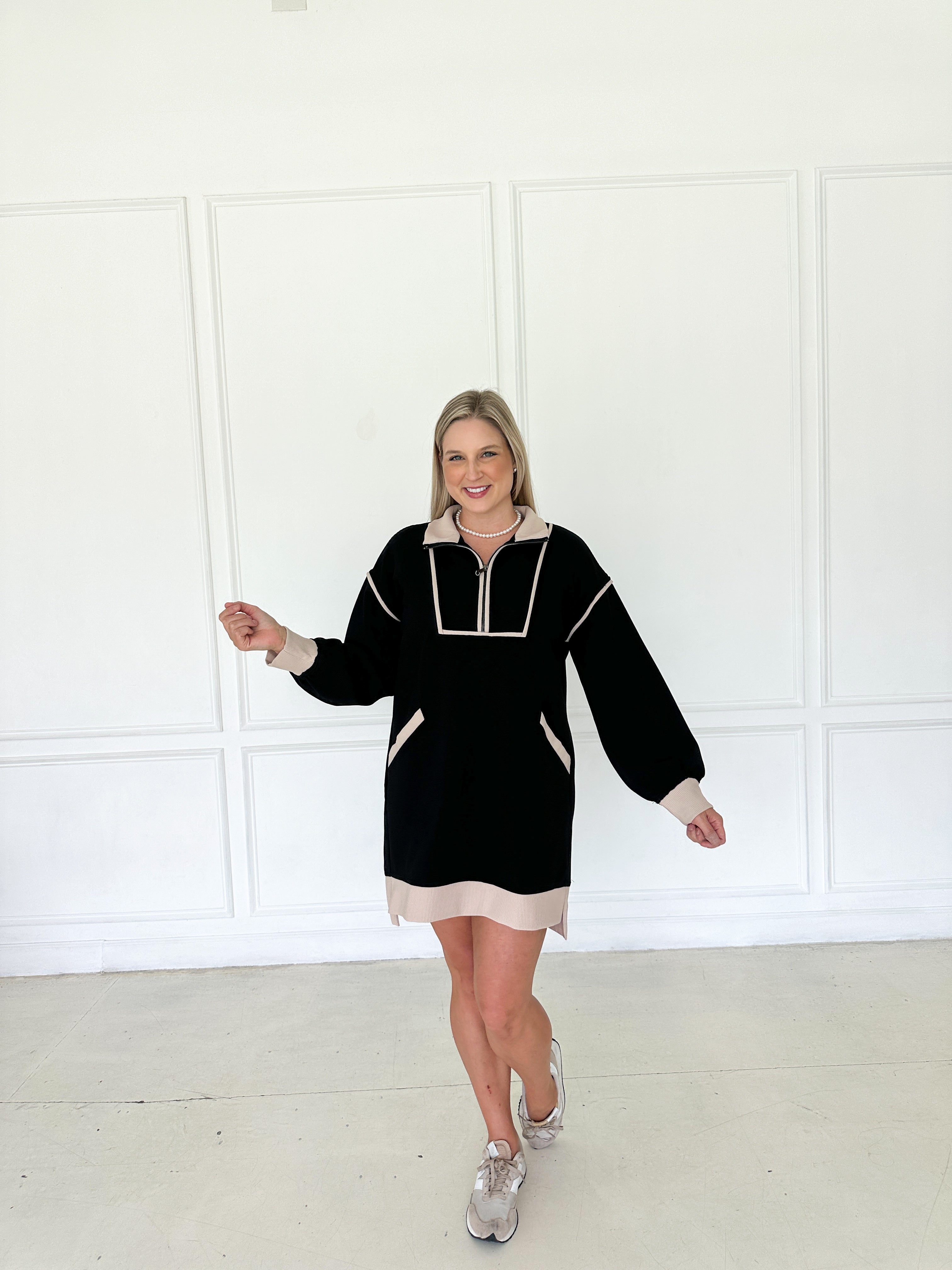 Unleash your sporty and stylish side with our Black Sporty Dress! Made with stretch material, it offers the perfect blend of comfort and flexibility. The contrasting neutral color combo and intricate detailing add a touch of elegance. With a 3/4 zipper at the neckline, long sleeves, and convenient pockets, this dress is perfect for any occasion. Elevate your wardrobe and feel confident in this must-have dress! 1-XL LEFT.