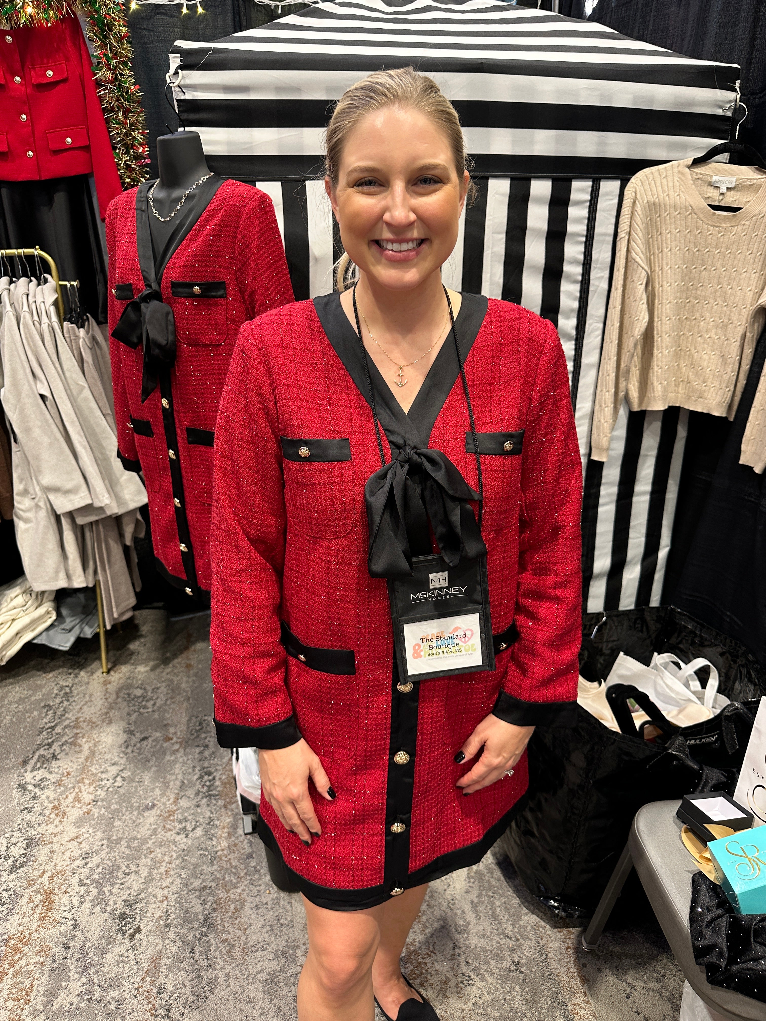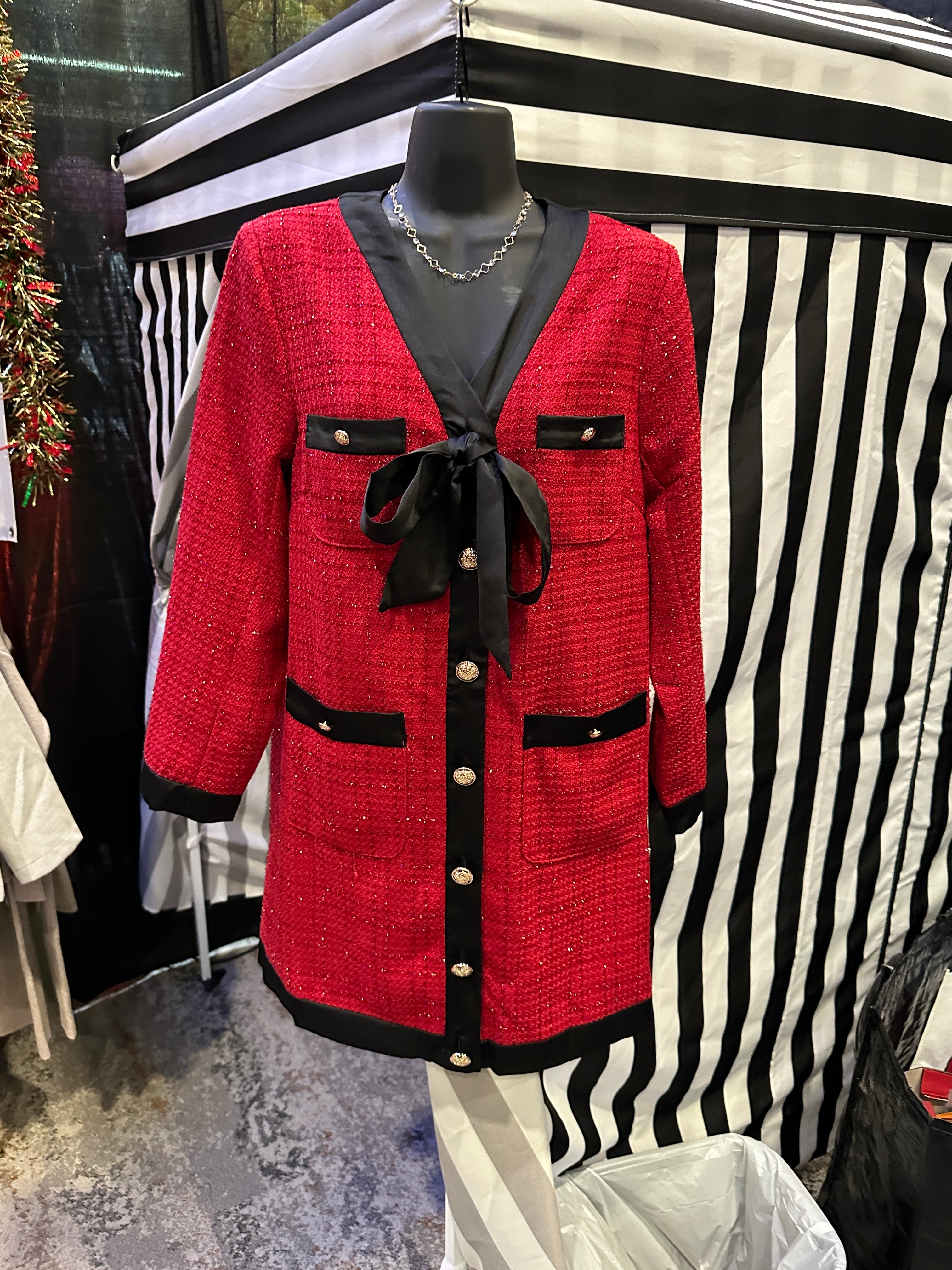 Slip into elegance with our Red & Black Dress. The shimmery red tweed adds a touch of holiday magic, while the black trim and functioning gold buttons provide a classic and sophisticated look. The fully lined dress features long sleeves and a v-neck, with a removable self bow tie for added versatility. Dress to impress this holiday season!