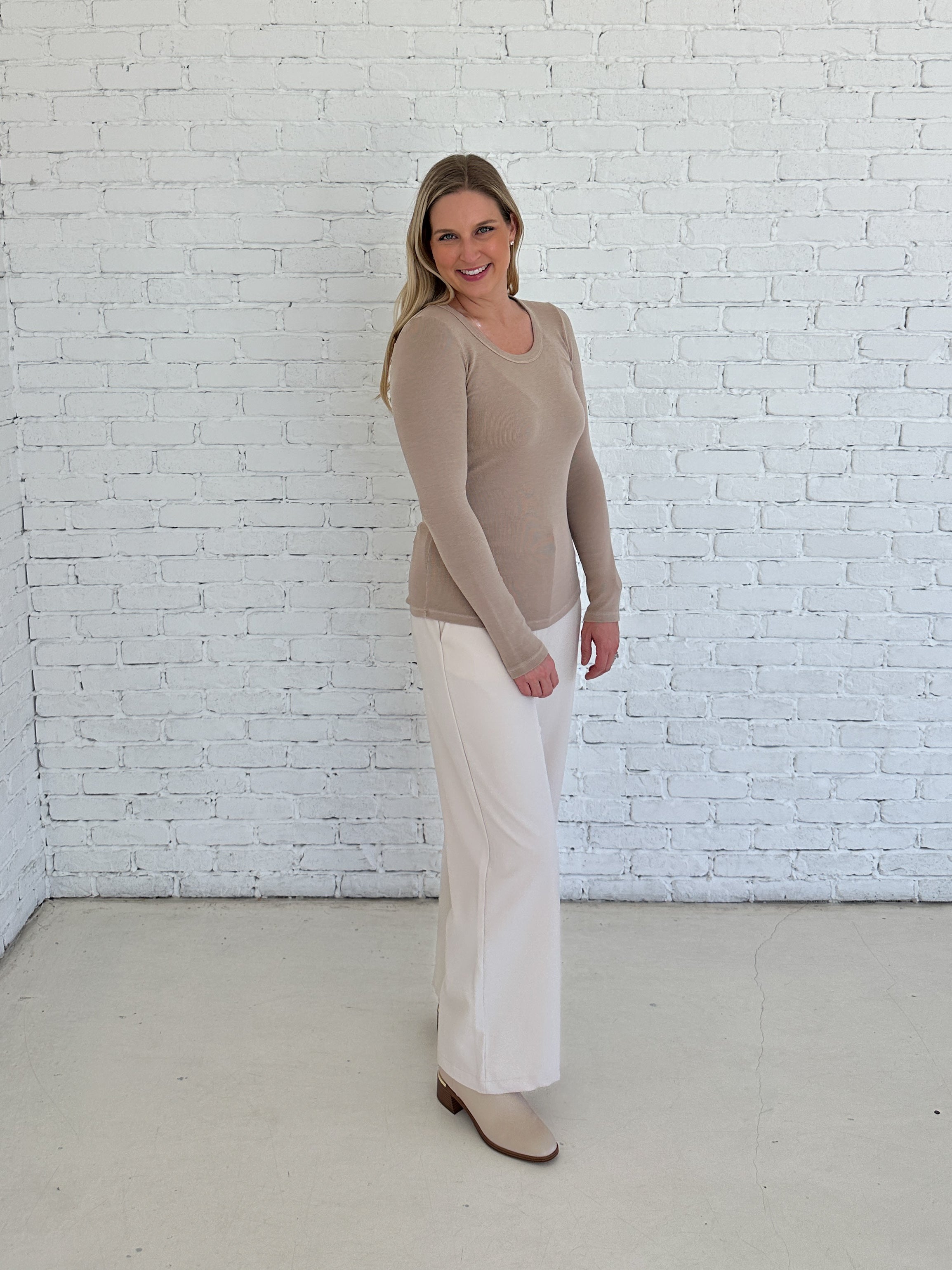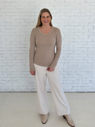 This beige scoop neck top features long sleeves and a fitted silhouette that flatters every shape. Crafted from super stretchy, soft micro-ribbed fabric, it ensures all-day comfort and ease of movement. Perfect as a versatile layering piece, it effortlessly complements any outfit, making it a must-have staple for your wardrobe. S-XL.