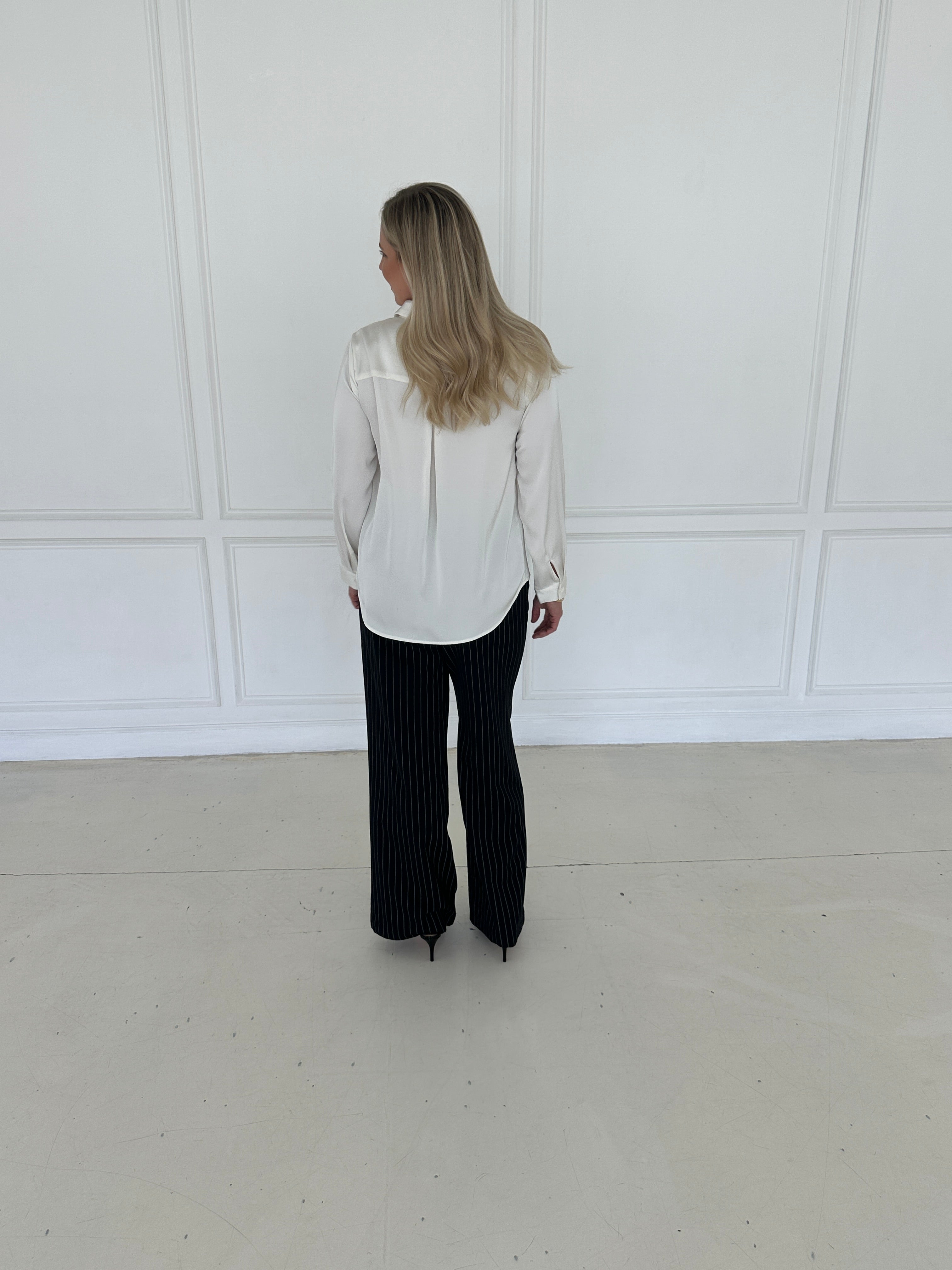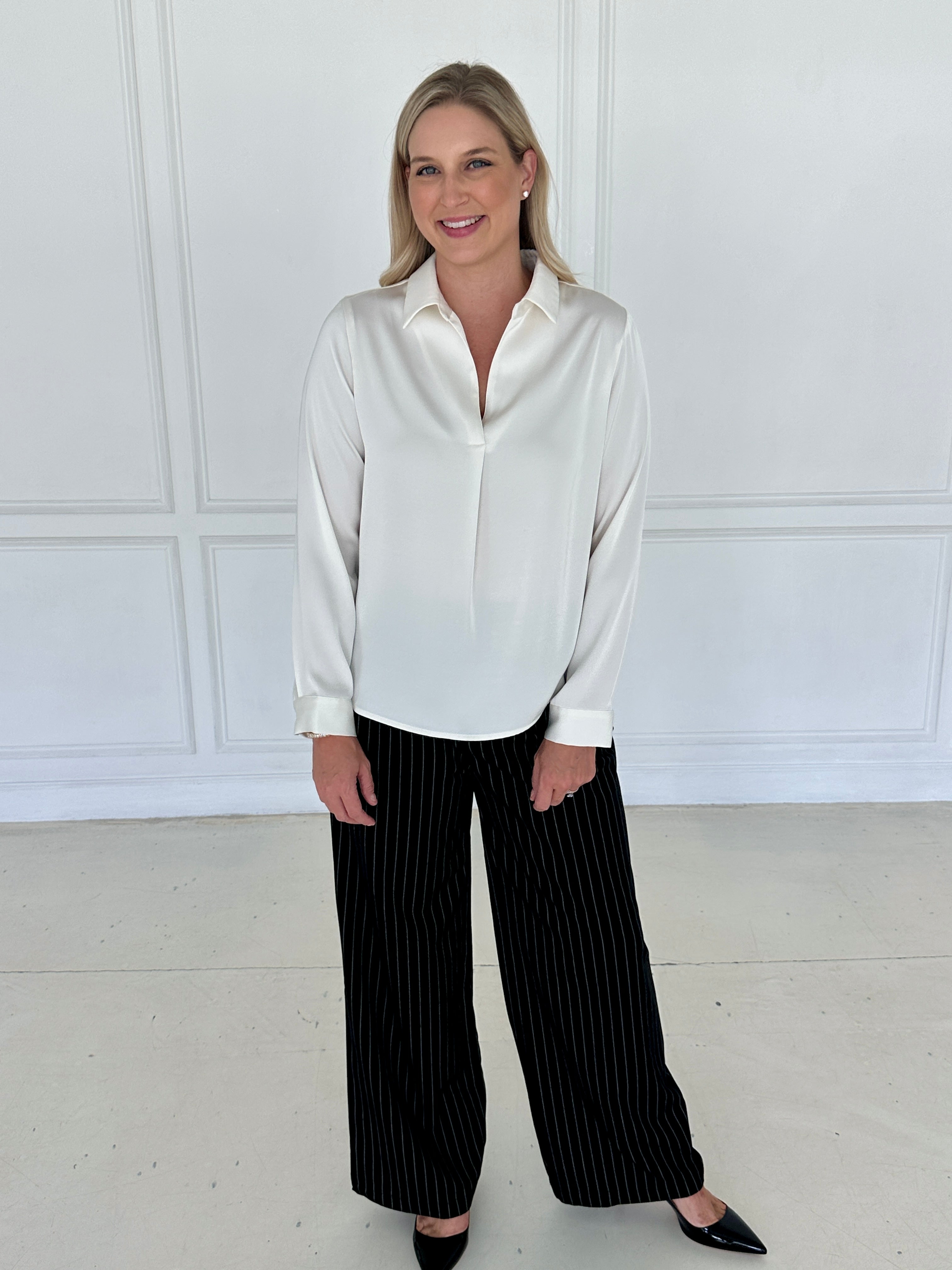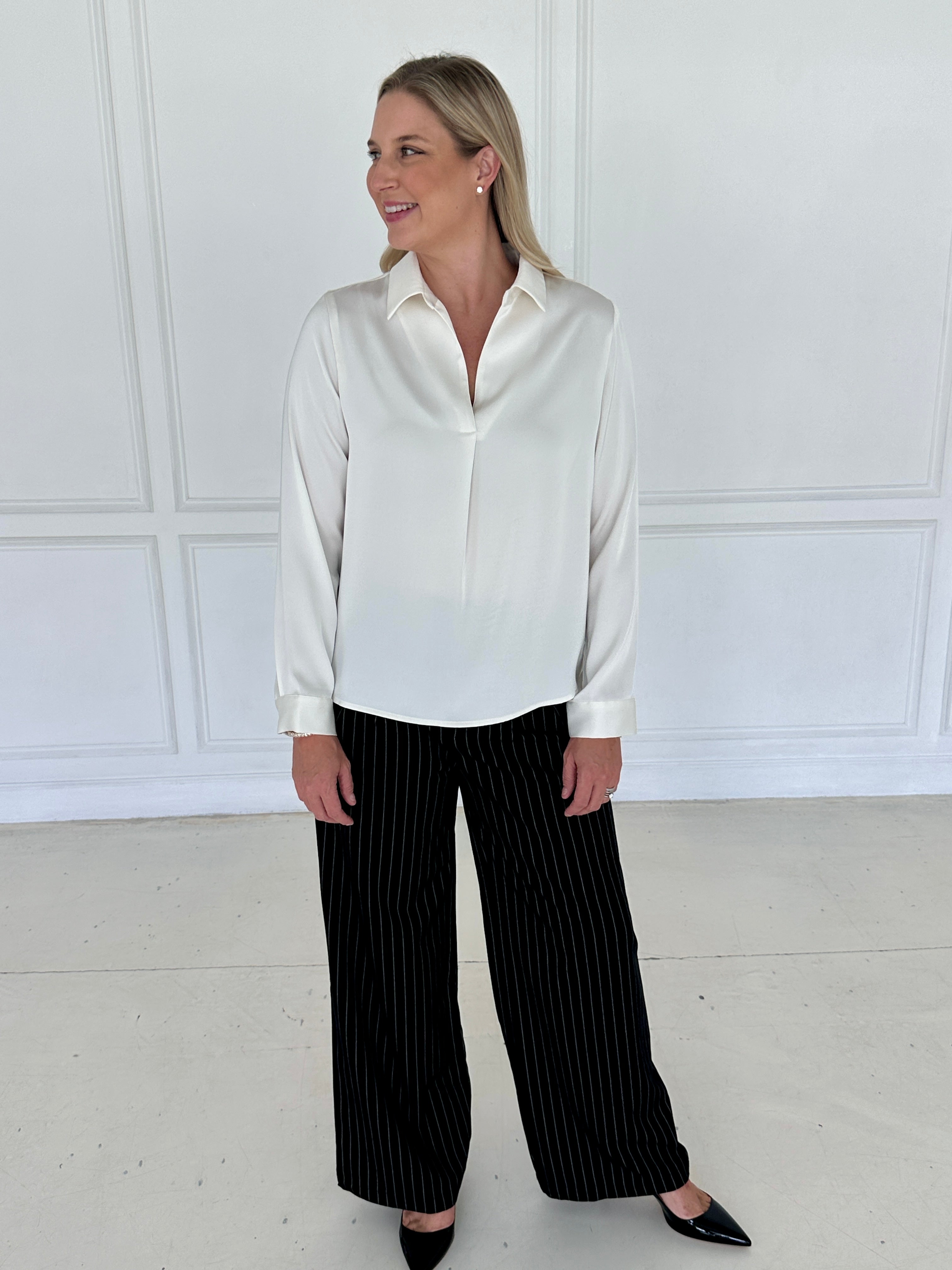 Elevate your wardrobe with this elegant Satin V-Neck Blouse in a timeless cream shade. Featuring long sleeves and a flattering V-neckline, it seamlessly blends comfort with sophistication. The smooth satin fabric drapes beautifully, making it perfect for both professional settings and evening outings. Its versatile design allows easy pairing with tailored pants or skirts for a polished look. This blouse brings a luxurious touch to your everyday style while ensuring you feel confident and effortlessly chic.