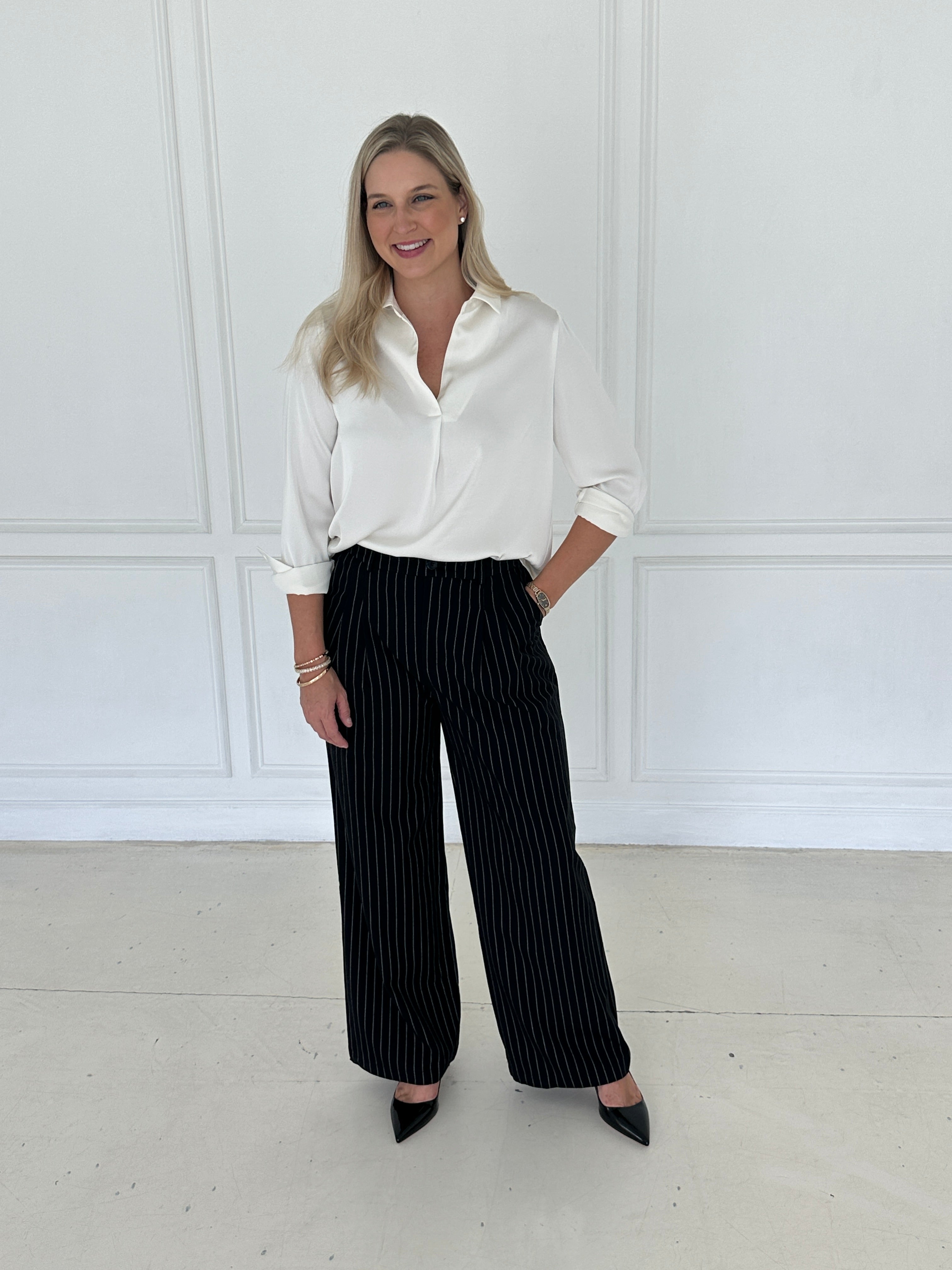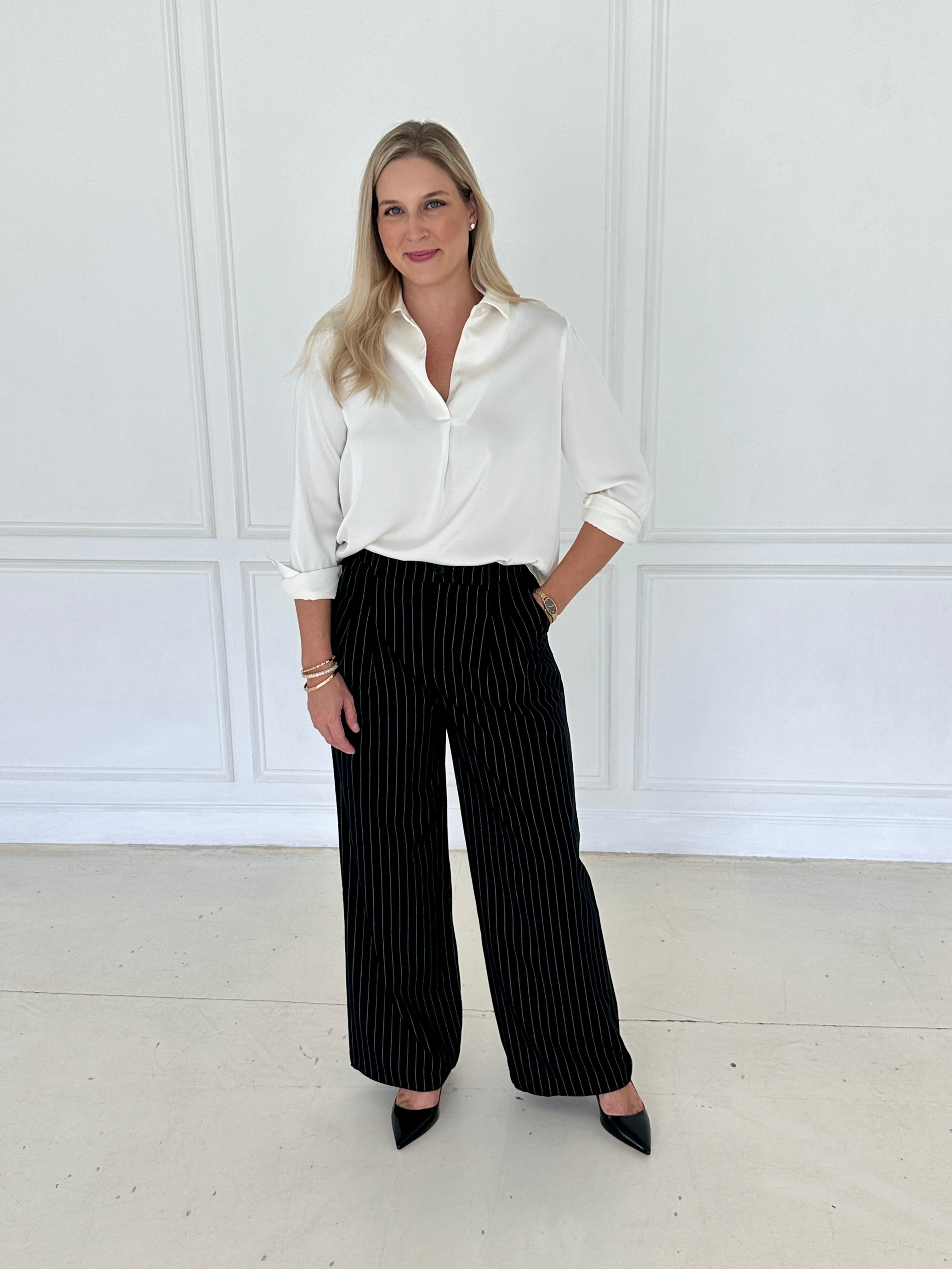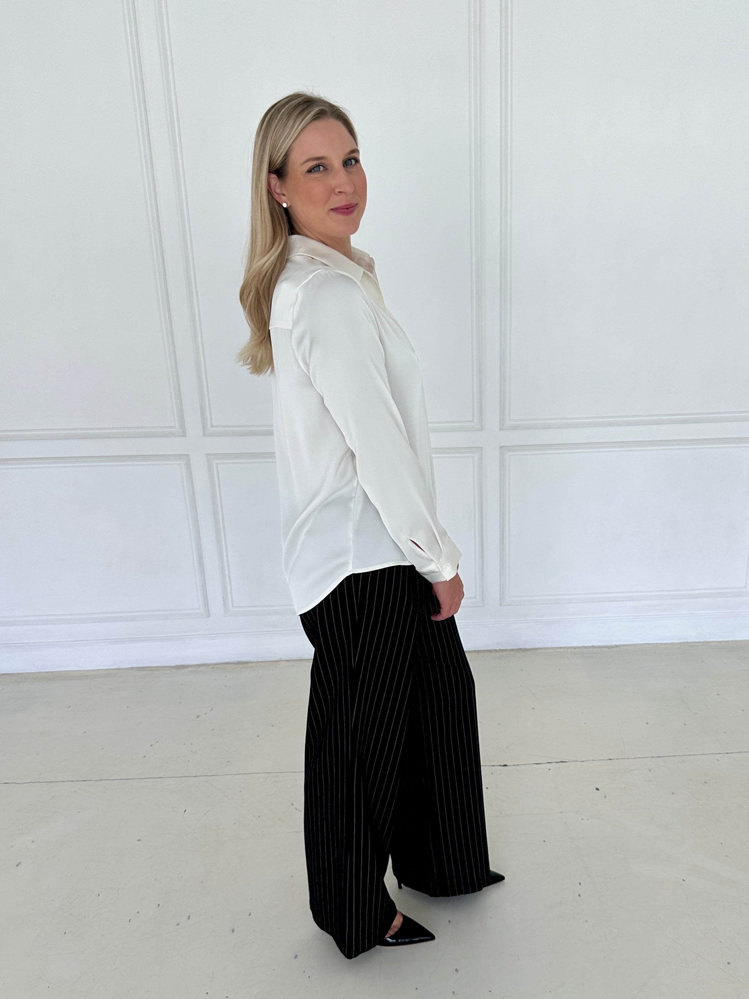 Elevate your wardrobe with this elegant Satin V-Neck Blouse in a timeless cream shade. Featuring long sleeves and a flattering V-neckline, it seamlessly blends comfort with sophistication. The smooth satin fabric drapes beautifully, making it perfect for both professional settings and evening outings. Its versatile design allows easy pairing with tailored pants or skirts for a polished look. This blouse brings a luxurious touch to your everyday style while ensuring you feel confident and effortlessly chic.