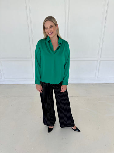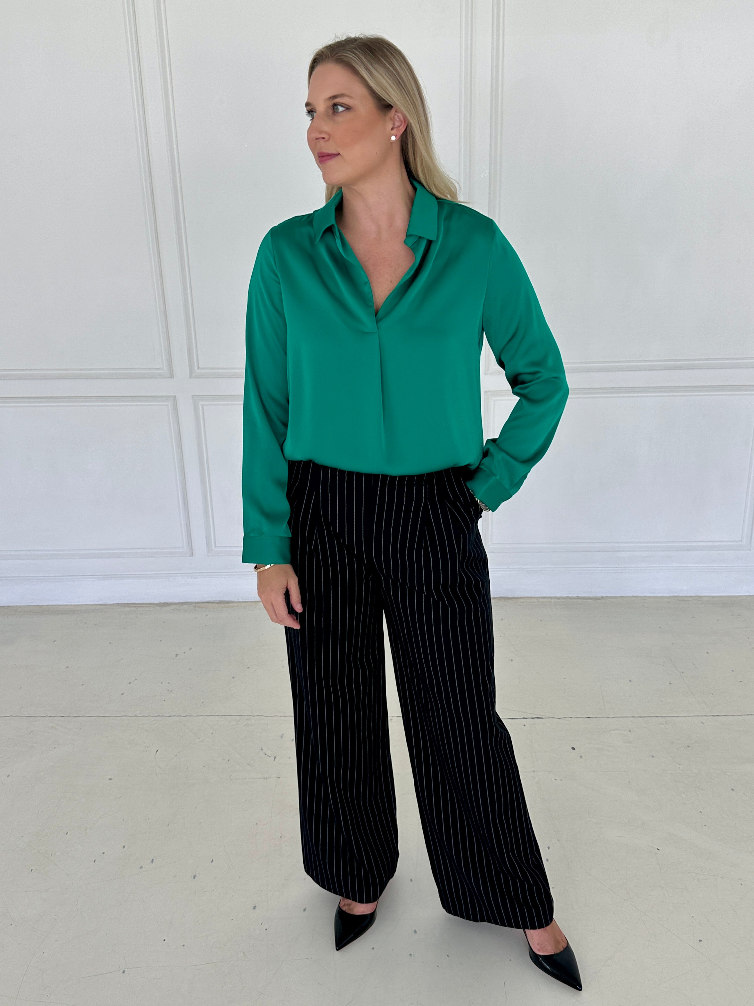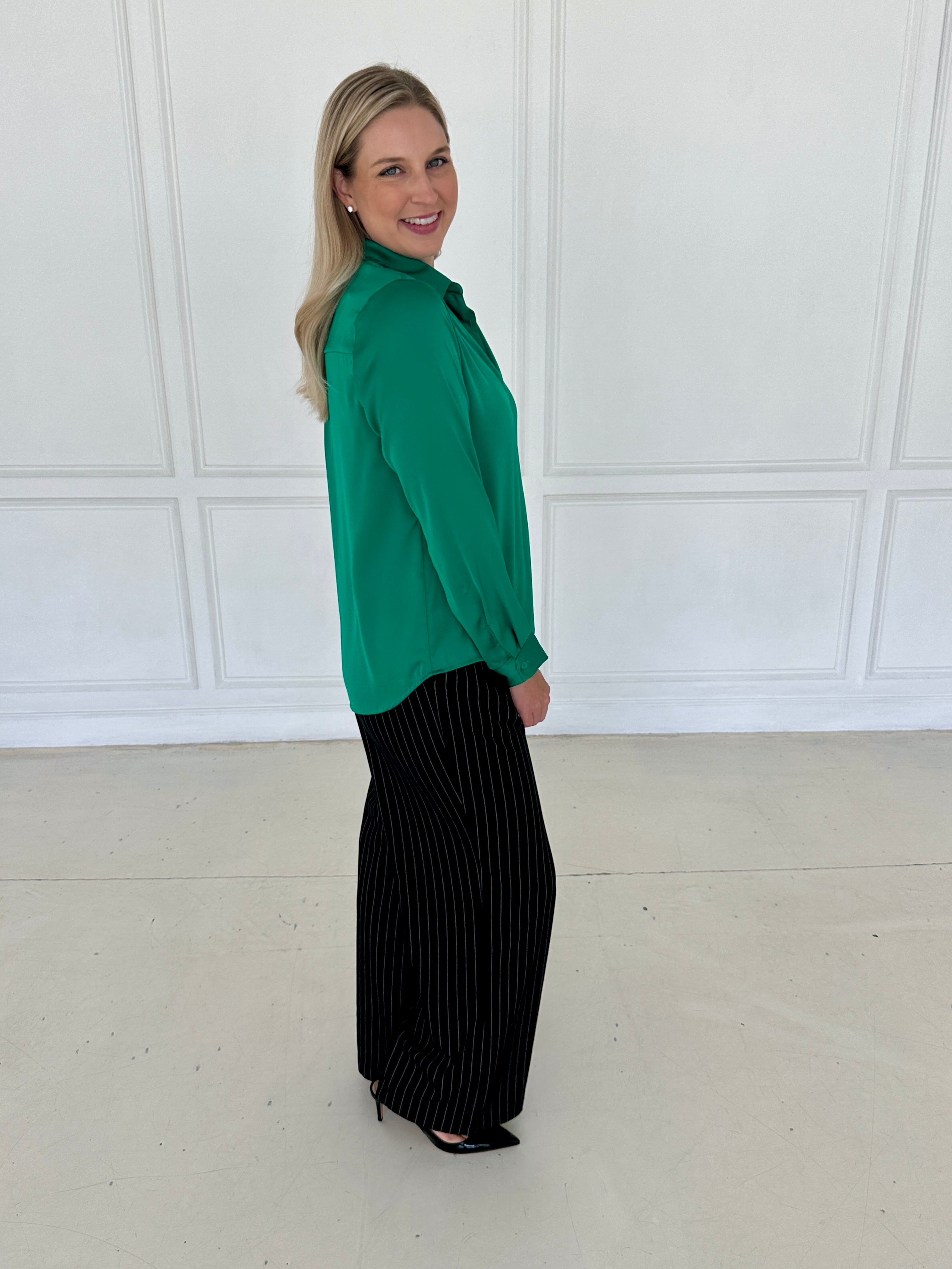 Satin Long sleeve blouse in with v-neck in Kelly Green. Skies are blue