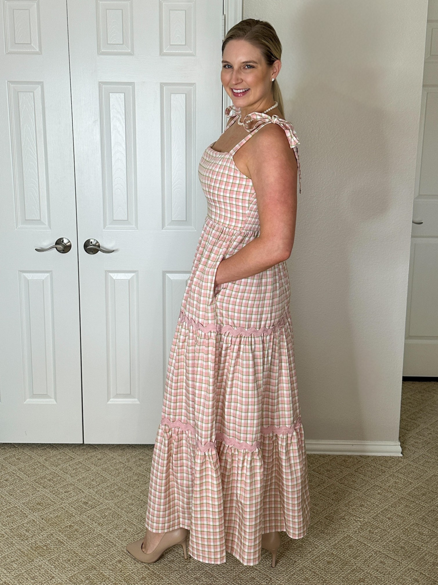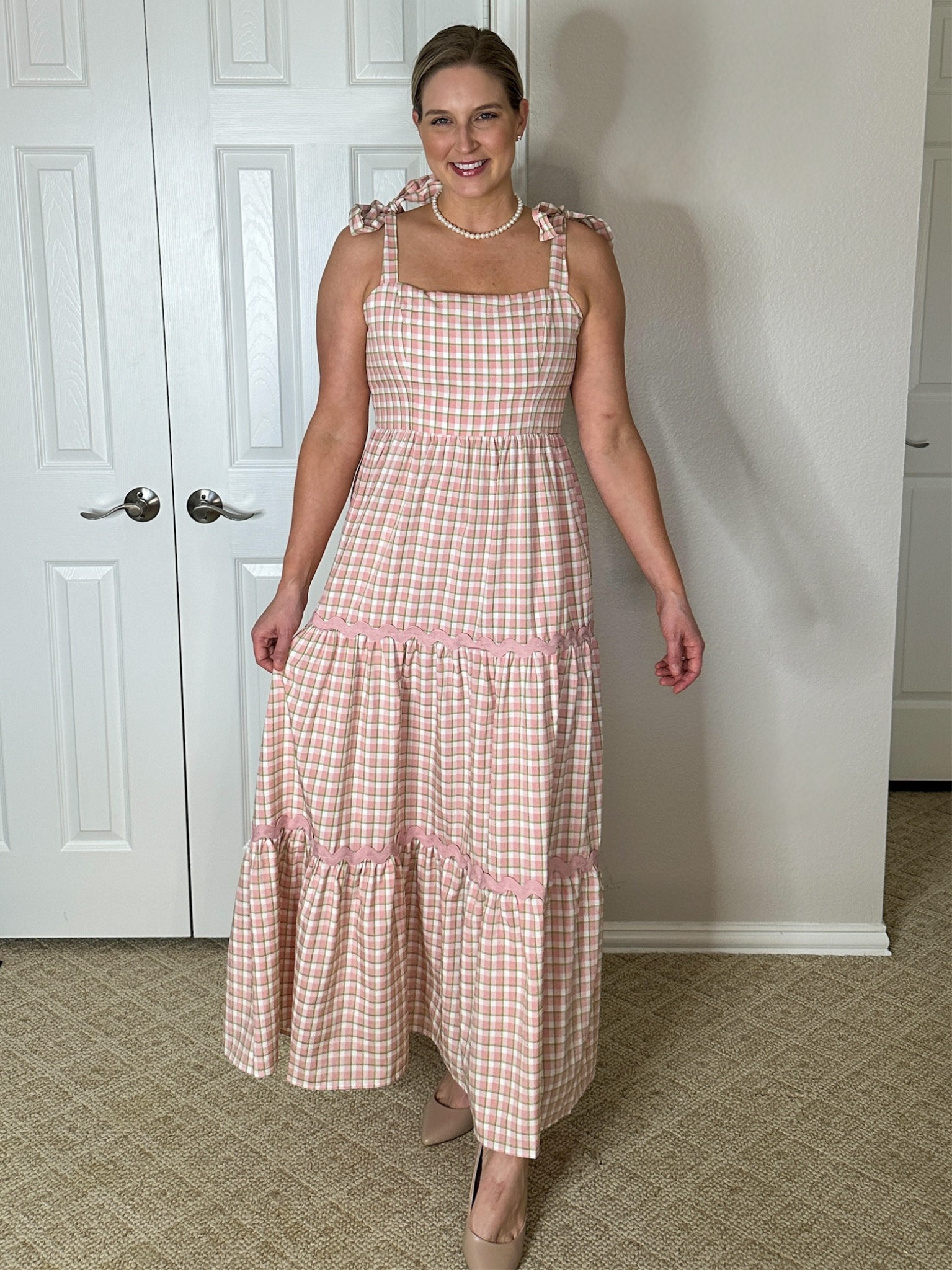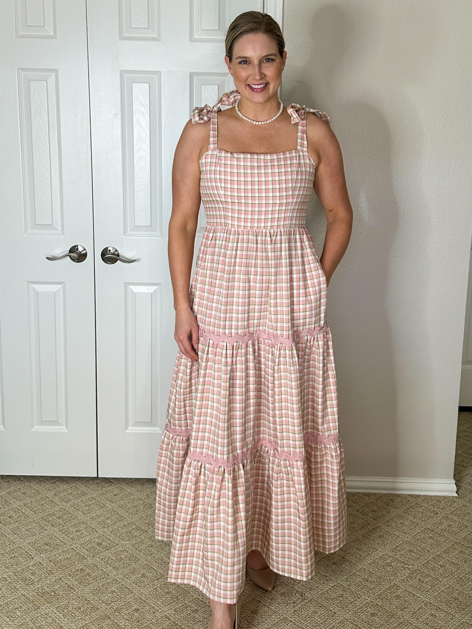 Experience the joy of wearing our Spring Plaid Maxi Dress! This dress boasts a stunning plaid yarn dye design with a straight neckline and delicate shoulder ties. The tiered skirt is adorned with charming ric rac trim, while the smocked back bodice provides a comfortable and flattering fit. Fall in love with the timeless elegance of this must-have dress.