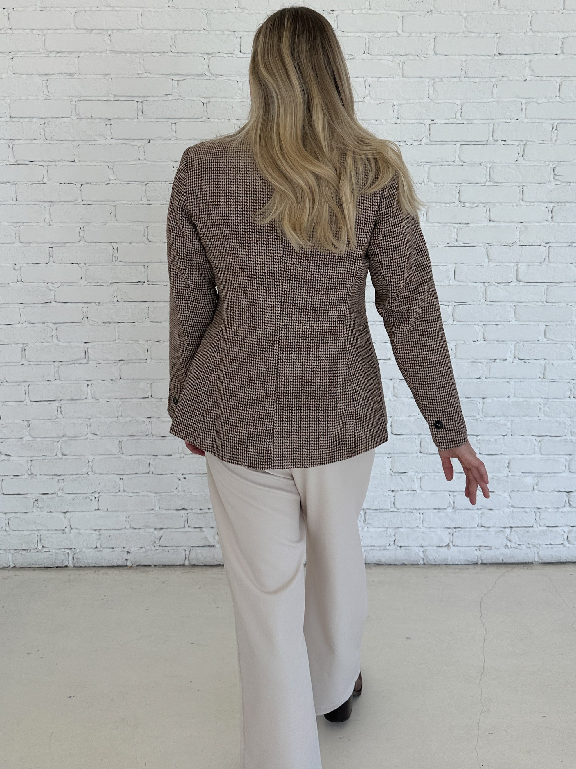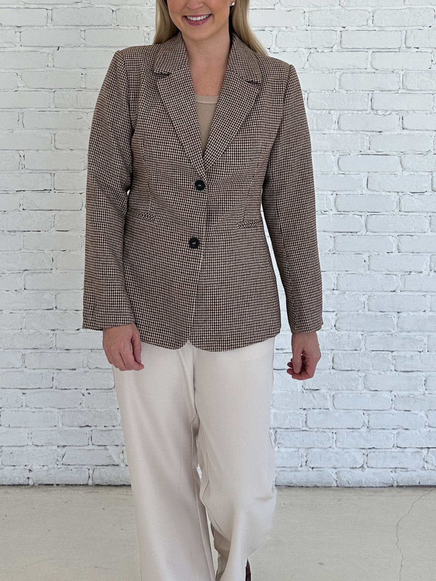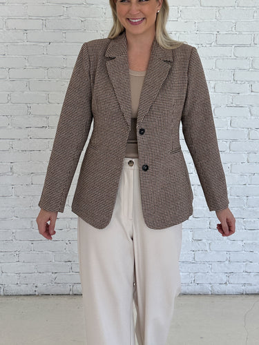 This tailored two-button blazer features a timeless check pattern that brings a refined and structured look. Its two-button front closure offers a classic touch, while subtle waist shaping enhances your silhouette for a flattering fit. Finished with long sleeves and crisp button details, it pairs effortlessly with the matching skirt or stands out on its own. Ideal for work, meetings, or autumn days, this versatile piece elevates any outfit. S-L