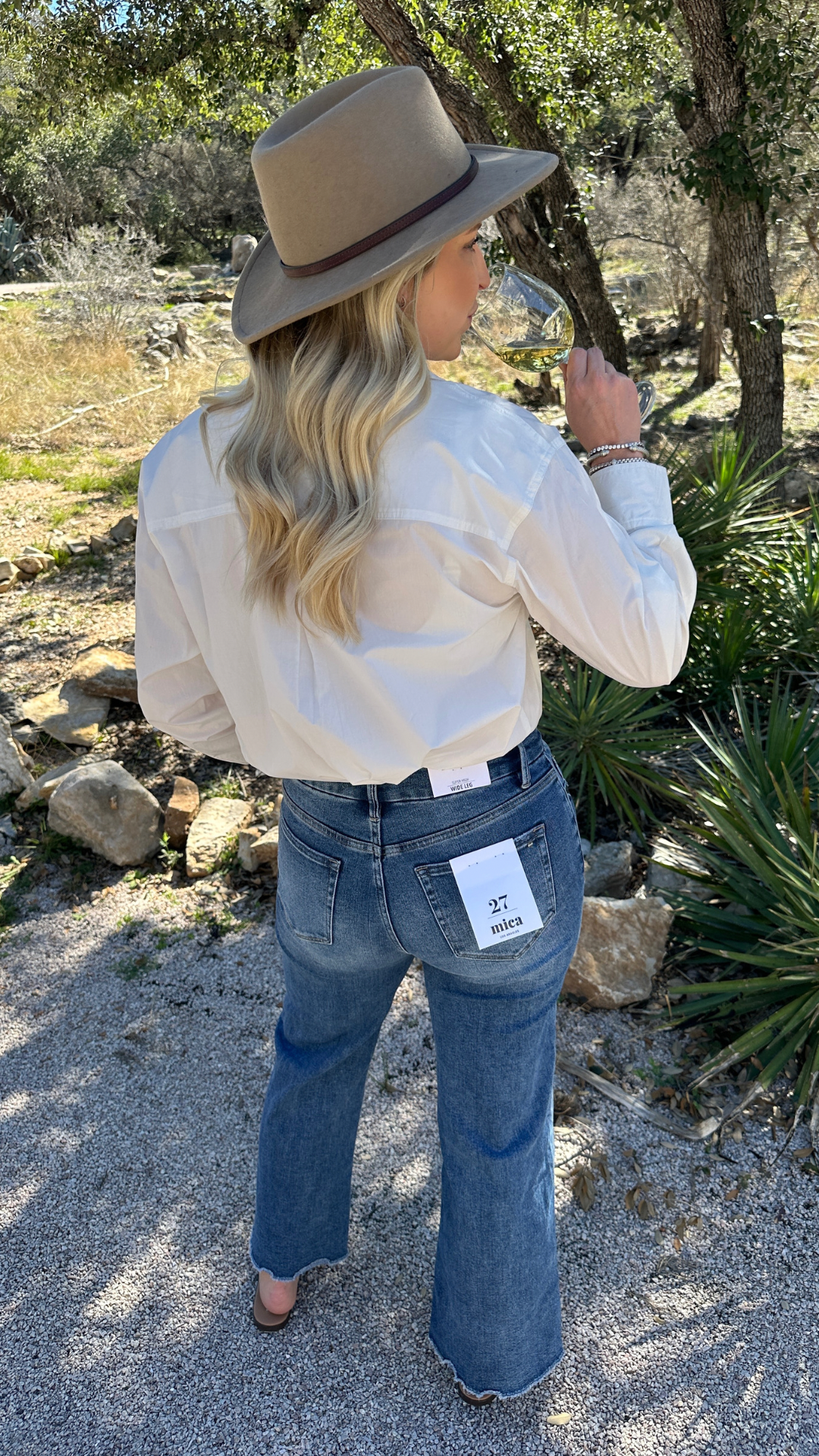 Super high wide leg denim Blue Jay Mica offers a trendy and classic look with its super high wide leg denim. Made from high-quality denim fabric, these pants are durable and comfortable, making them perfect for everyday wear. The wide leg design provides a relaxed and stylish look, while the high waistline elongates the legs for a flattering silhouette. Stay on-trend and comfortable with these Mica Denim jeans in Blue Jay with super high wide leg denim.