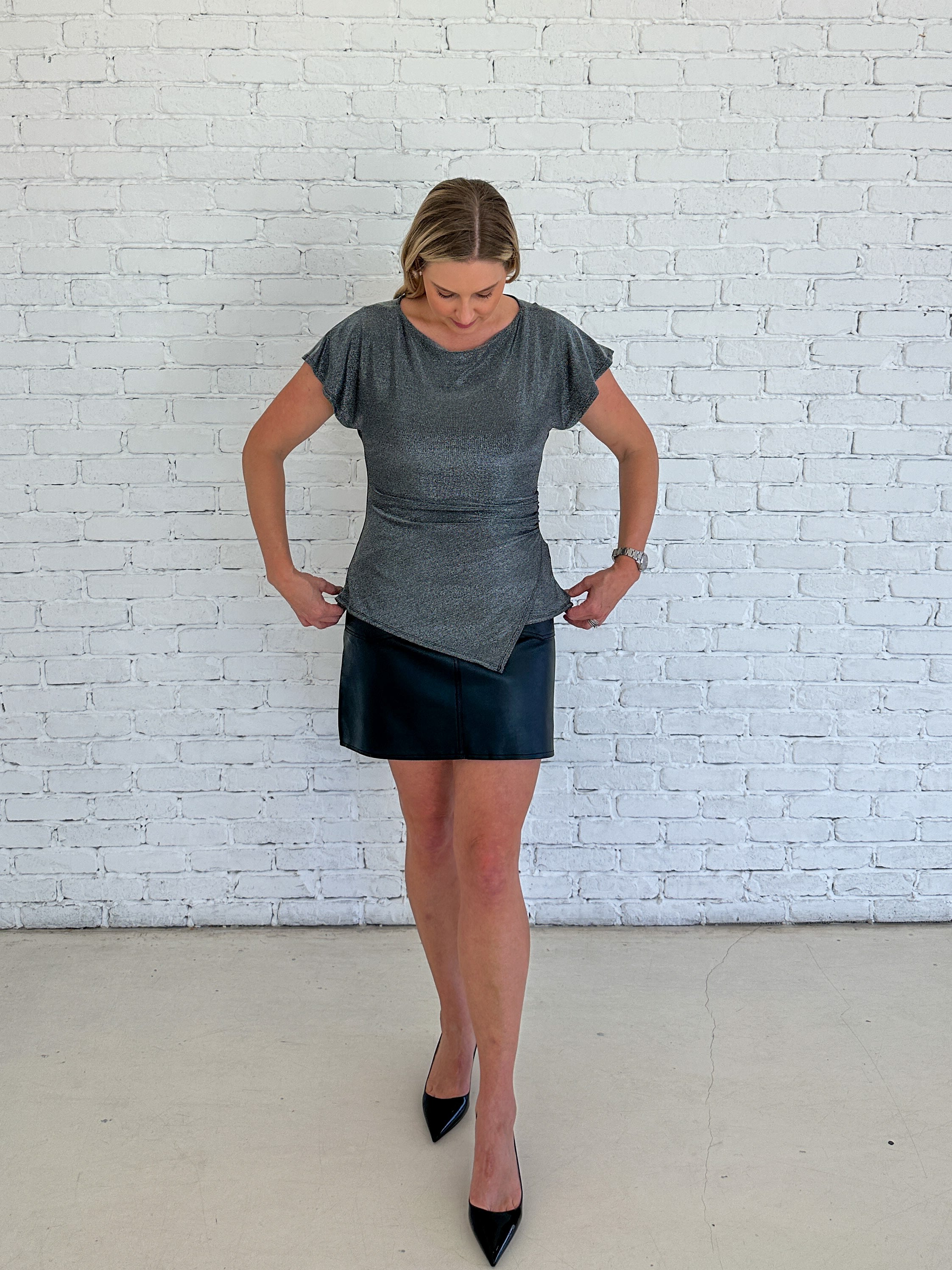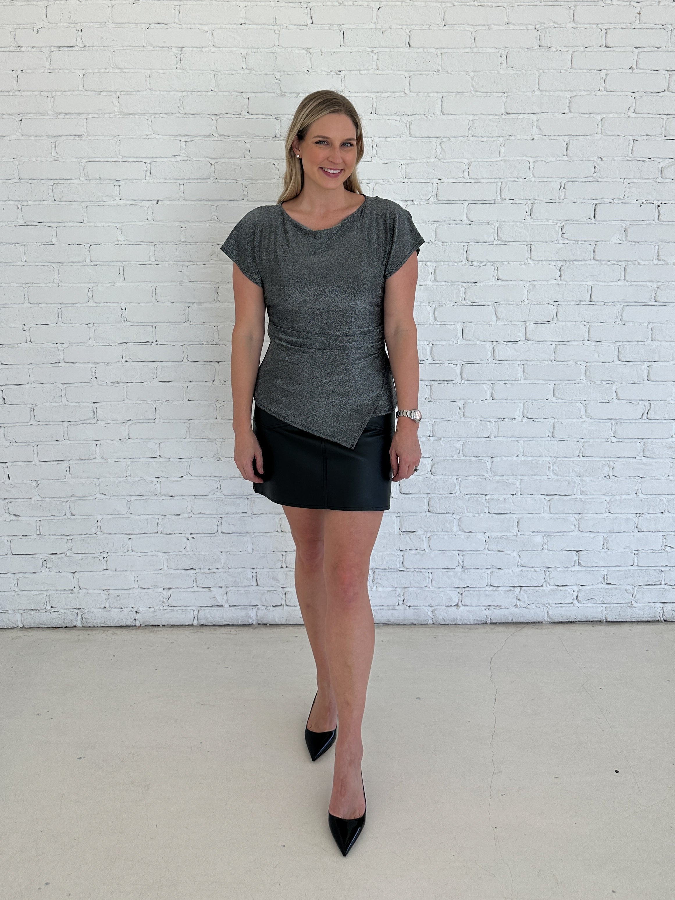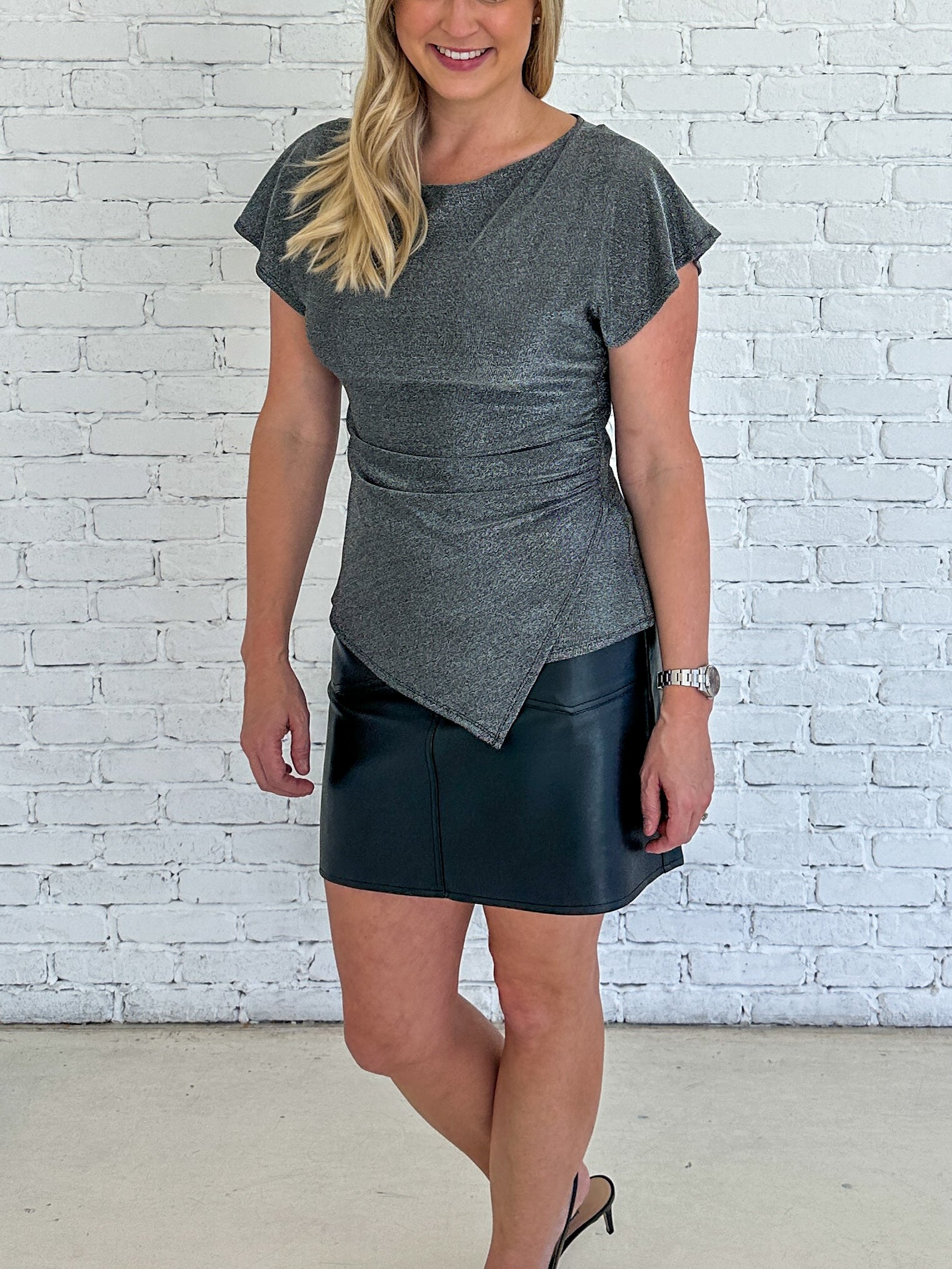 Elevate your holiday wardrobe with the Silver Sparkle Wrap Top. Its ruched design and crew neckline offer a flattering fit, while the very stretchy fabric ensures all-day comfort. The versatile A-line cut lets you effortlessly dress it up or down for any festive occasion, making it the perfect choice to shine throughout the season. S-XL