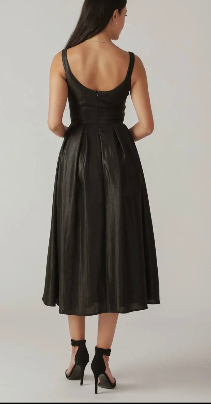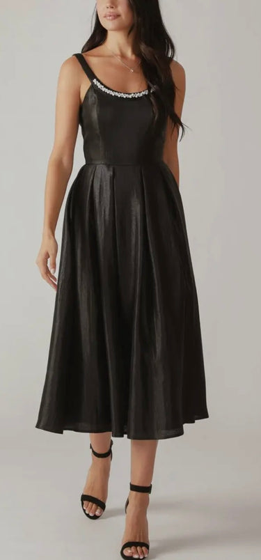 This elegant black tie dress features sparkling pearl-like embellishments and a sleek metallic fabric. Its sleeveless design and lining provide a comfortable and sophisticated look, perfect for any formal occasion. With its midi length, this dress will make you stand out with style and glamour. Available S-L.
